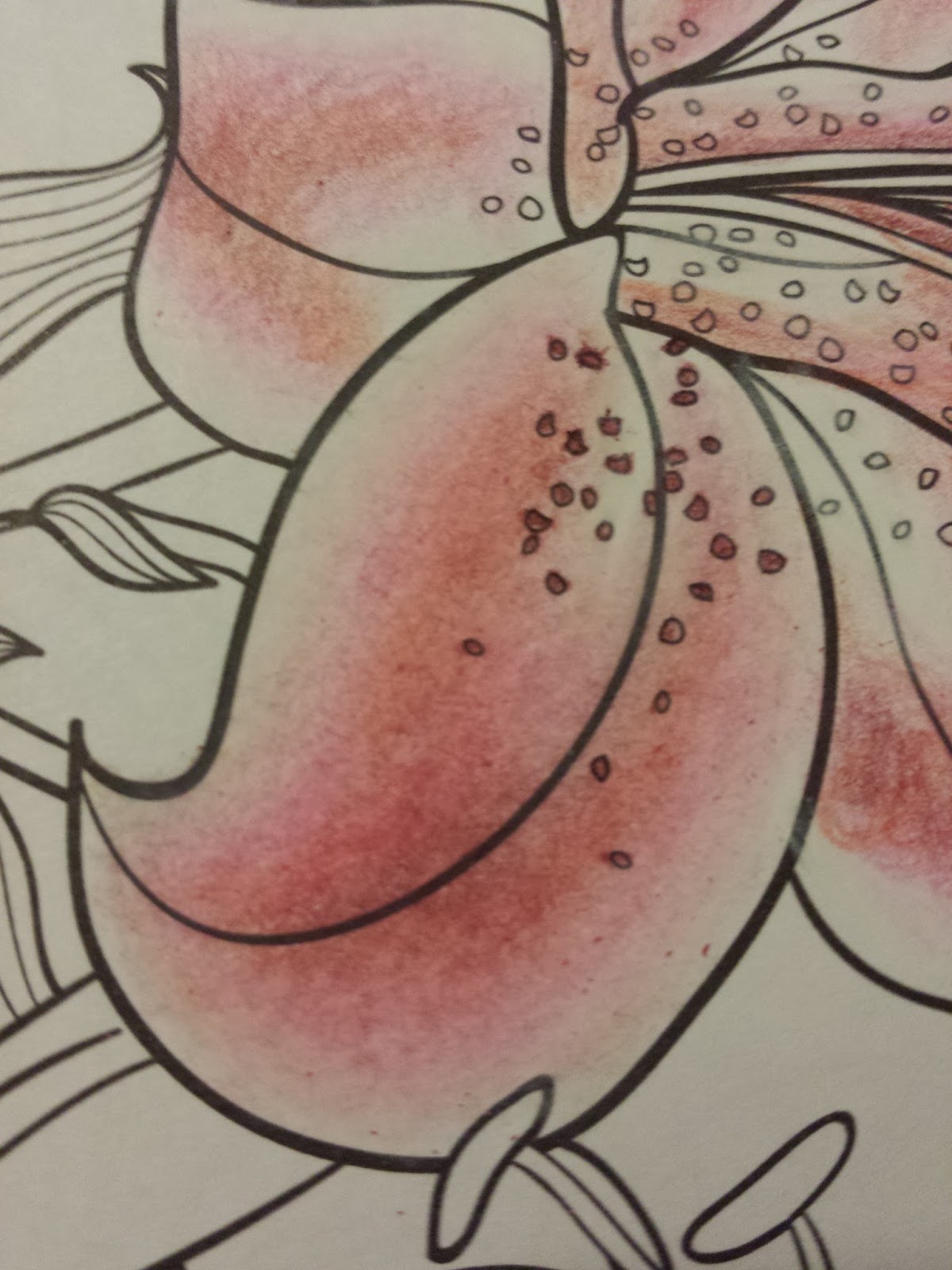 Above... I added in the Scarlet Lake. Below, has Tuscan Red added. I also want to add that I do try to do all of one thing at a time. I want to be sure that I am doing all of a particular flower with all the same colors with all the same pressure on the pencils in this case.